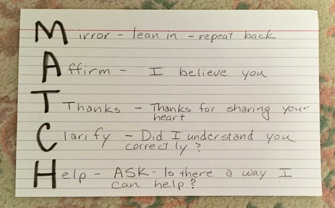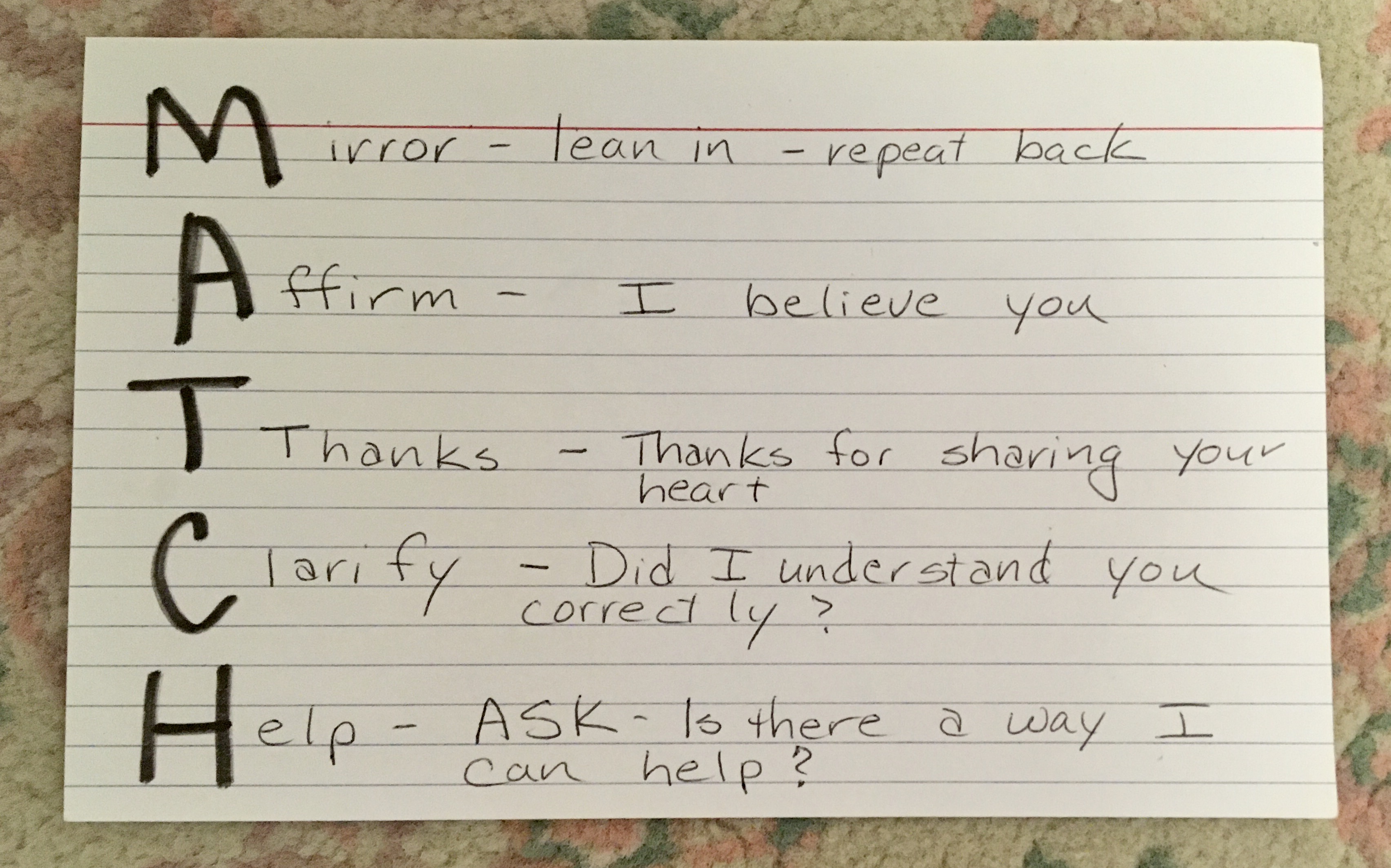 M- Mirror – lean in to the person you are talking to and repeat back what you think you heard