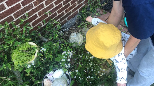 Winnie forgets her annoyance with her hat as she reaches for everything the outside offers. Weeds! Rocks! Walkways! Flowers! Ants! Spiders!