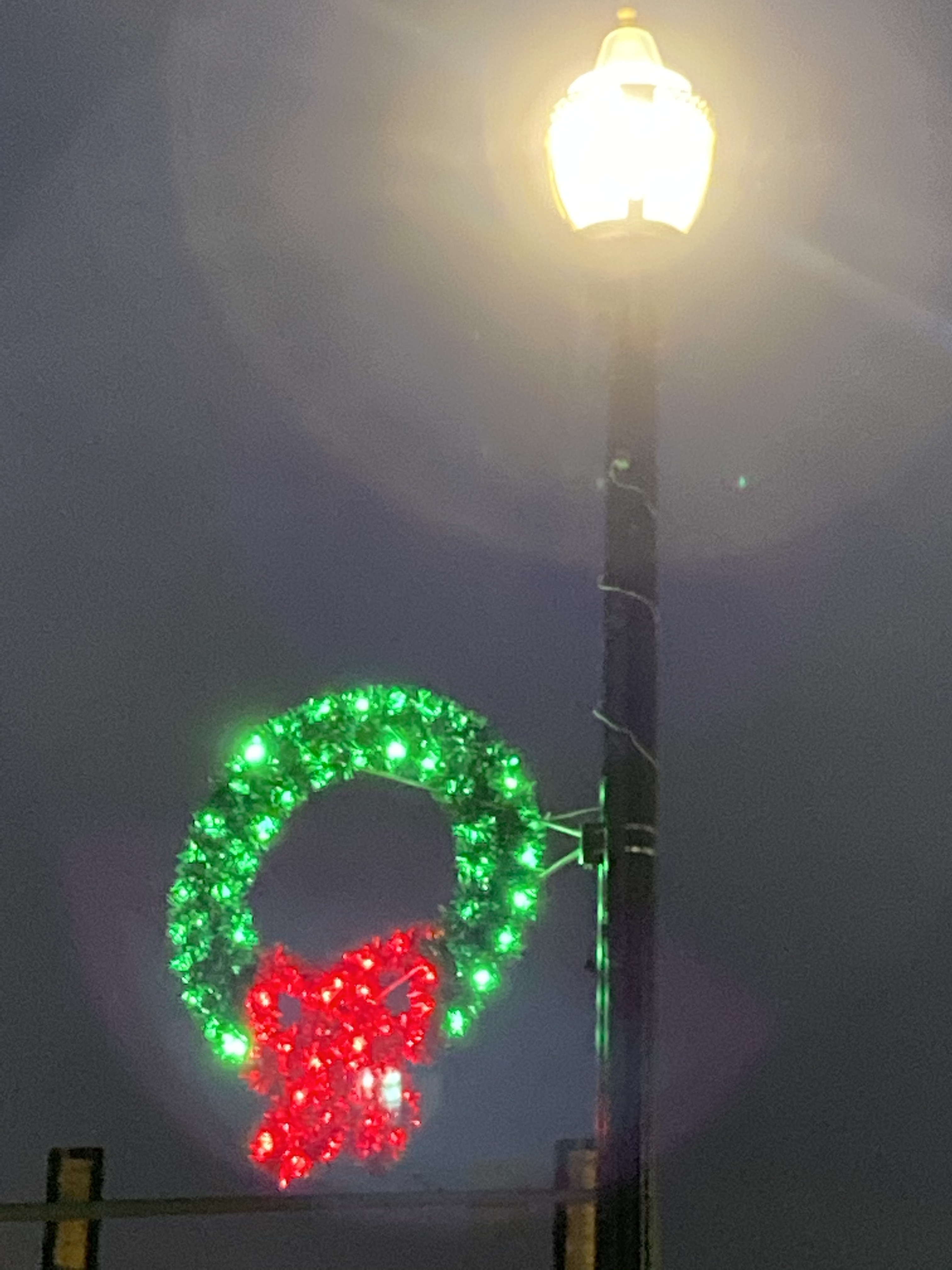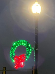 Cheery wreaths and candy canes are suspended from old-fashion street lights.