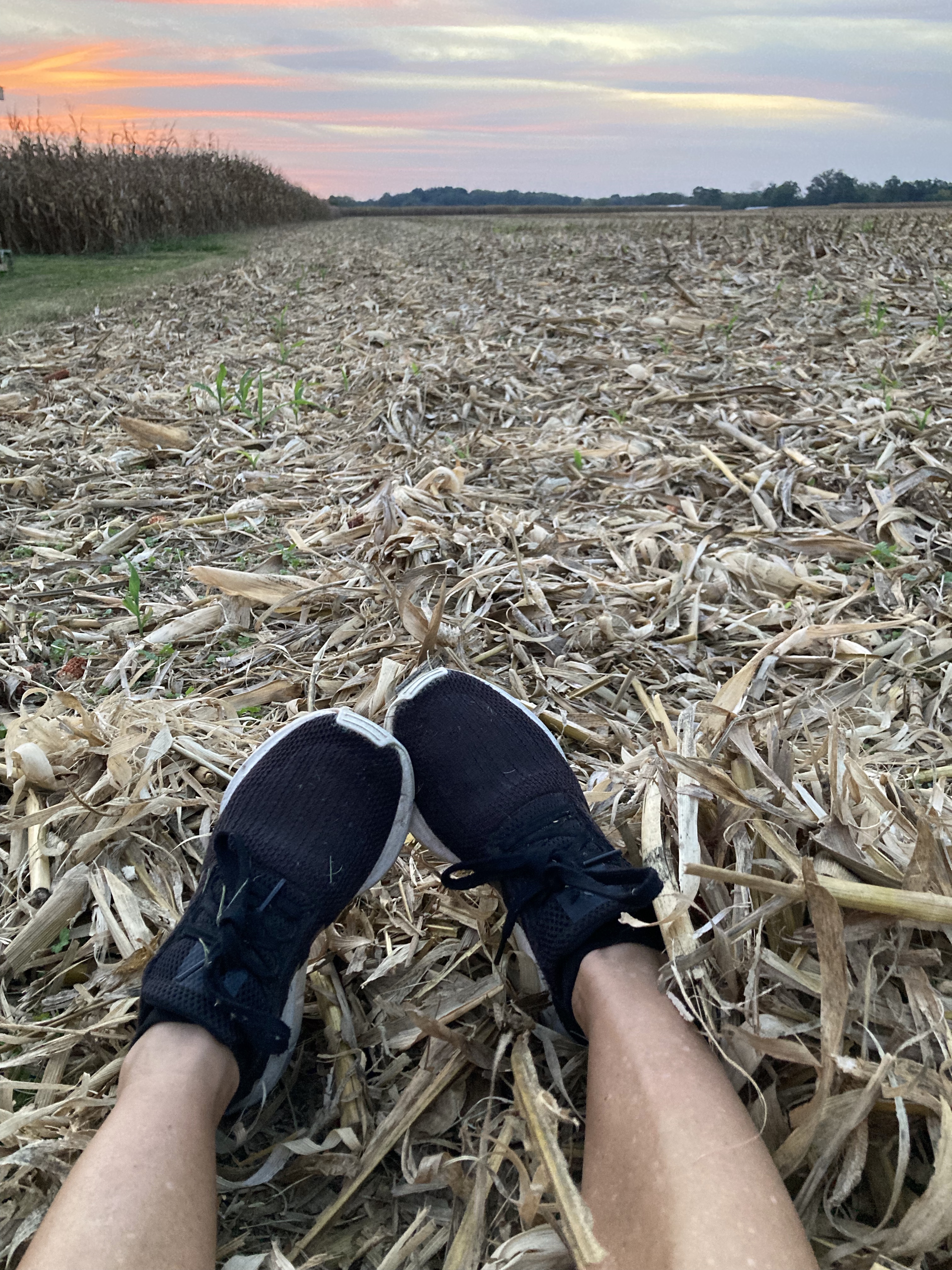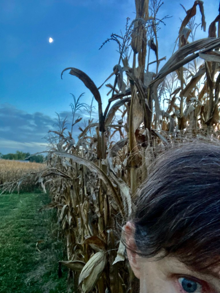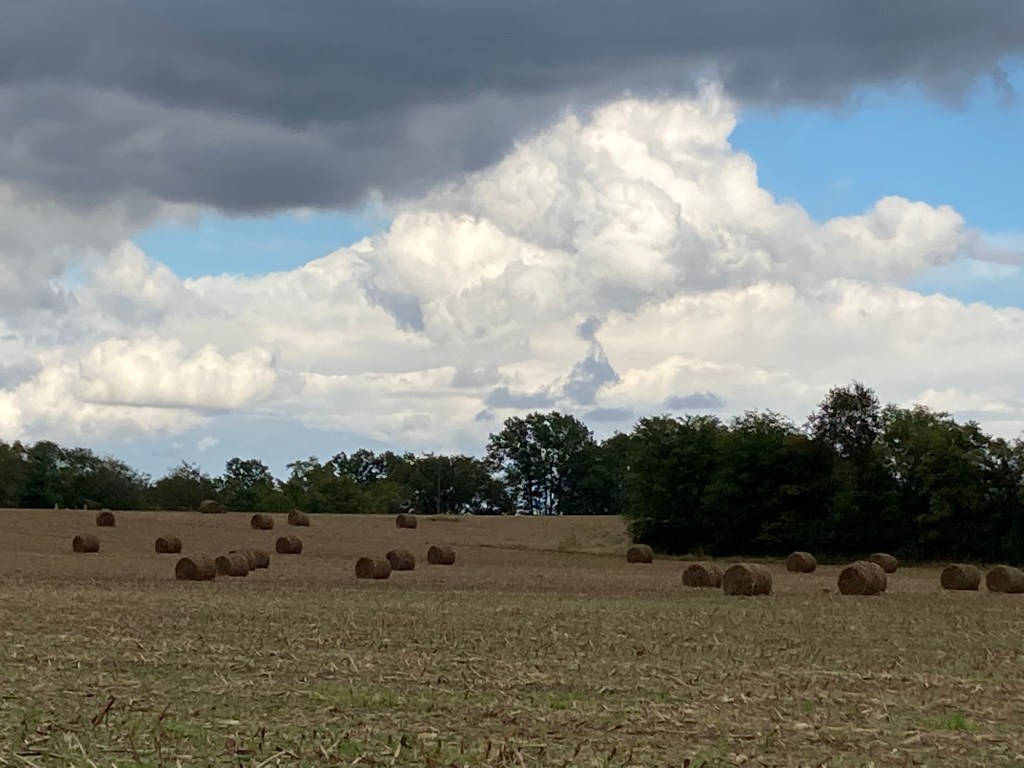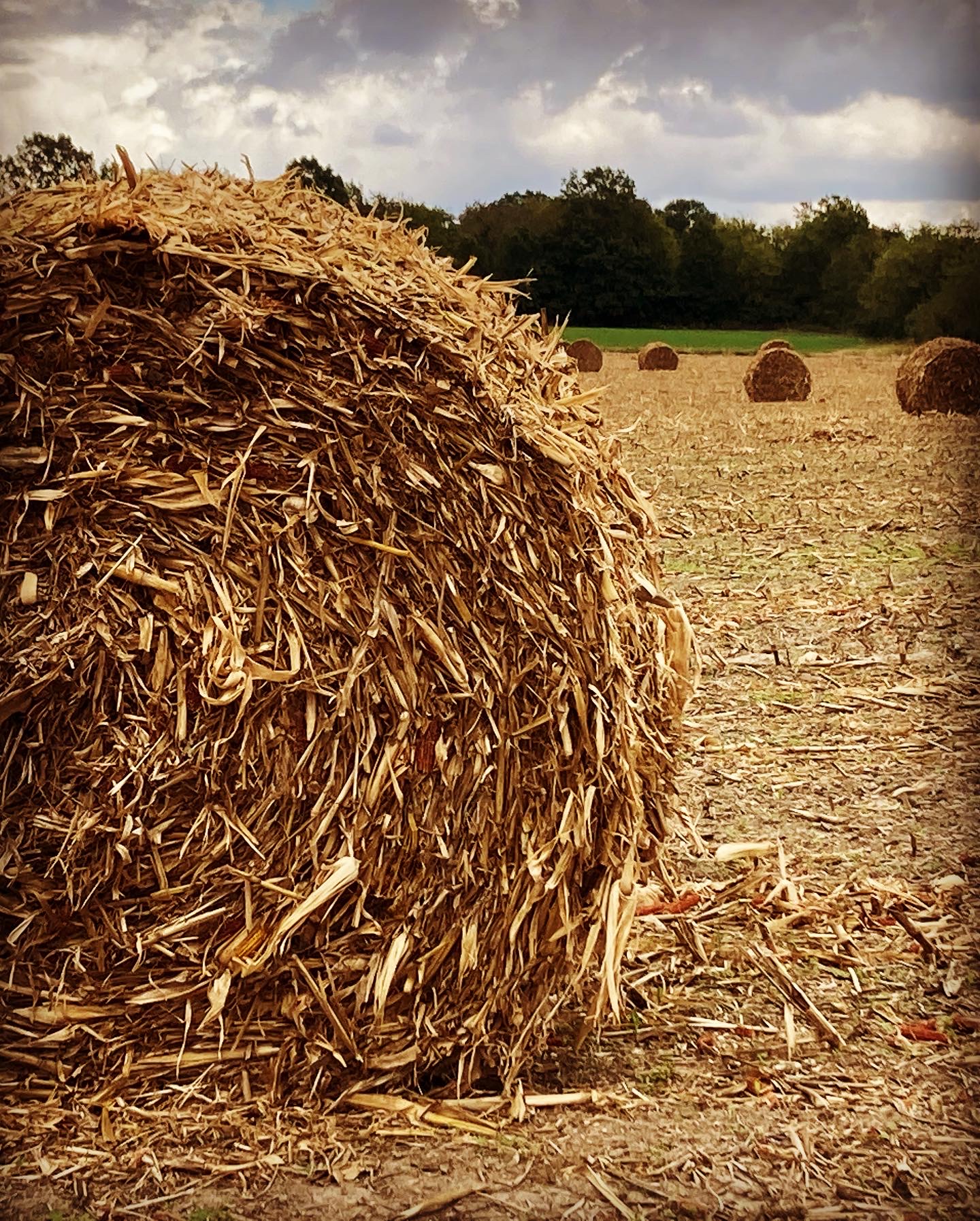 I love these fields with bales and I’m curious about them. One day, I stepped into a field and took a photo. The bales wrapped stalks and husks and cobbs, all the stubble of the harvested field.