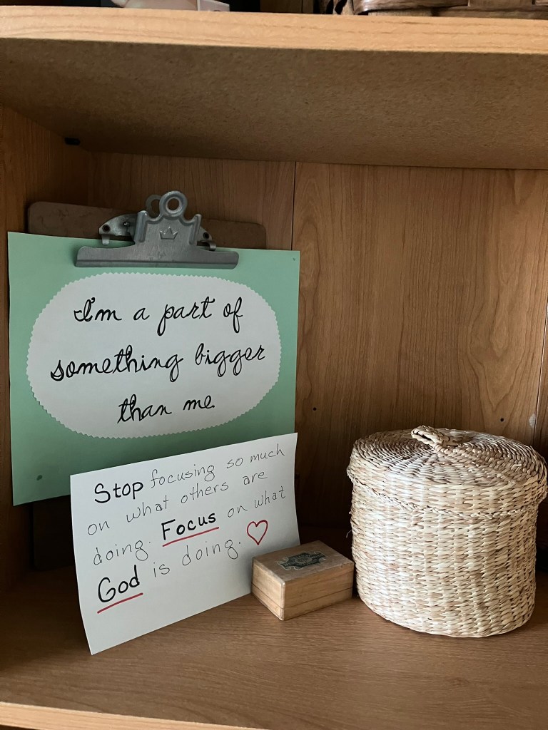 Sometimes I walk from room to room in my house. I look at treasures I carefully arranged on bookshelves. God calmed me down as I placed these keepsakes from my old home.