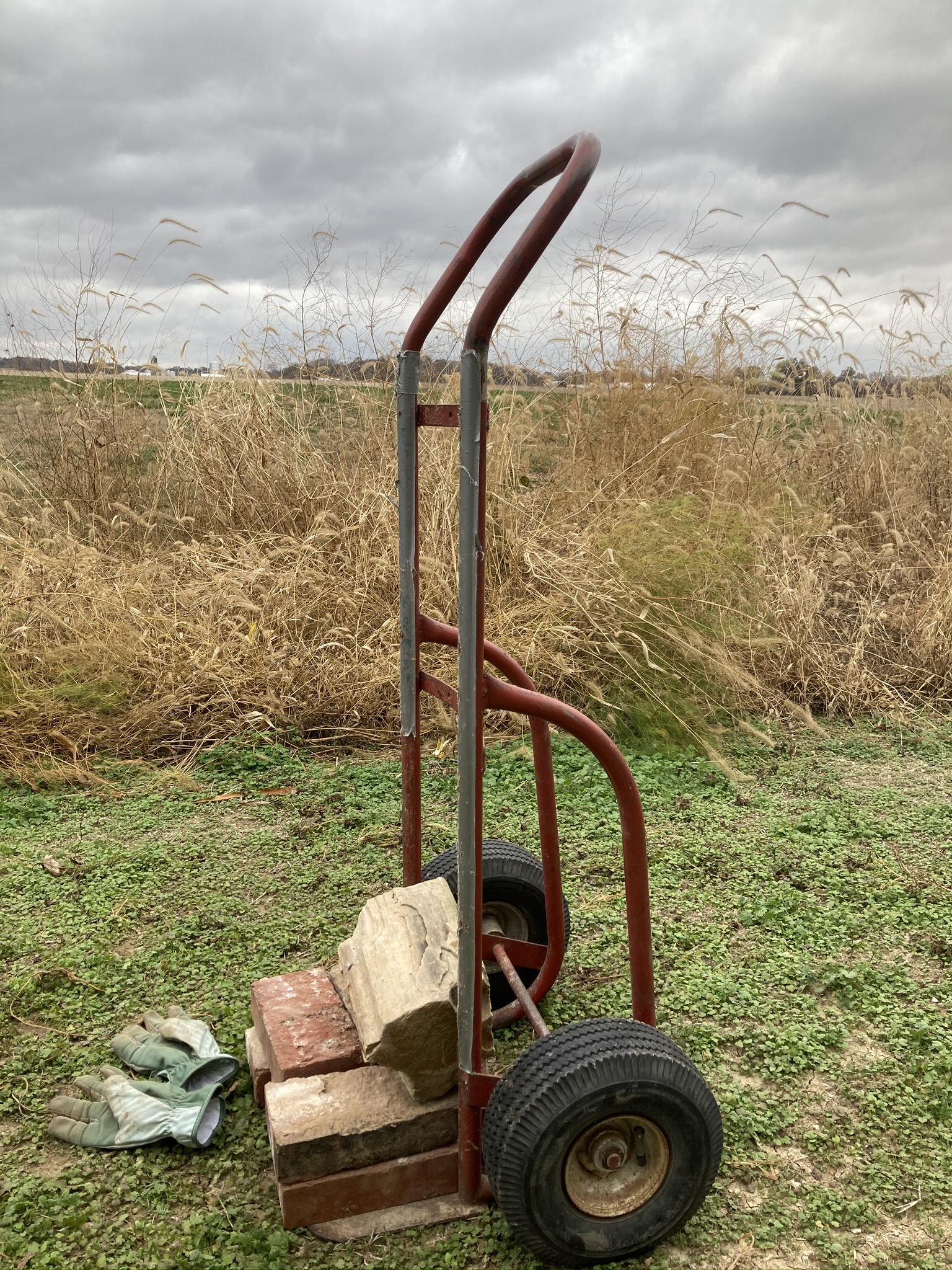 I loaded up a half-track cart with pathway bricks. I moved limestone borders and bucketed iris.