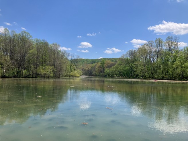 I turned left on Tobacco Port Road. I found a lake! A huge pool lingered lazily at the base of hills.