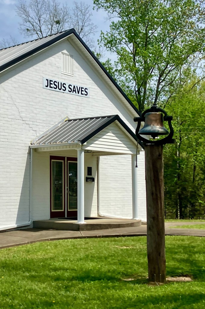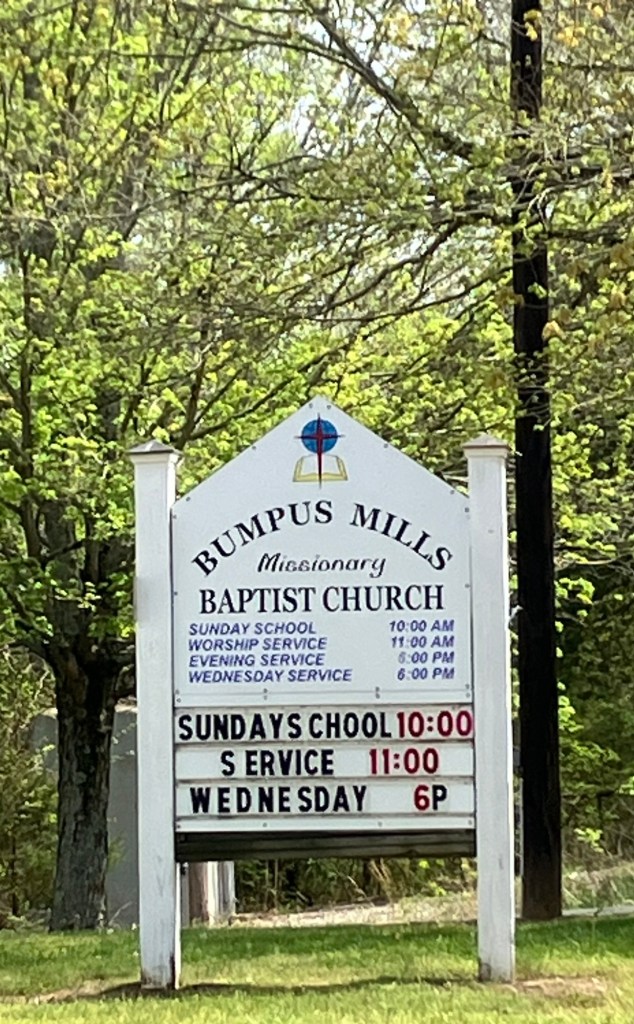 Bumpus Mills was an unlikely town hidden on a hillside. I passed a mechanics garage and Bumpus Mills Baptist Church. The sign above their door declared “Jesus Saves.” I figured that’s enough to keep any town going.