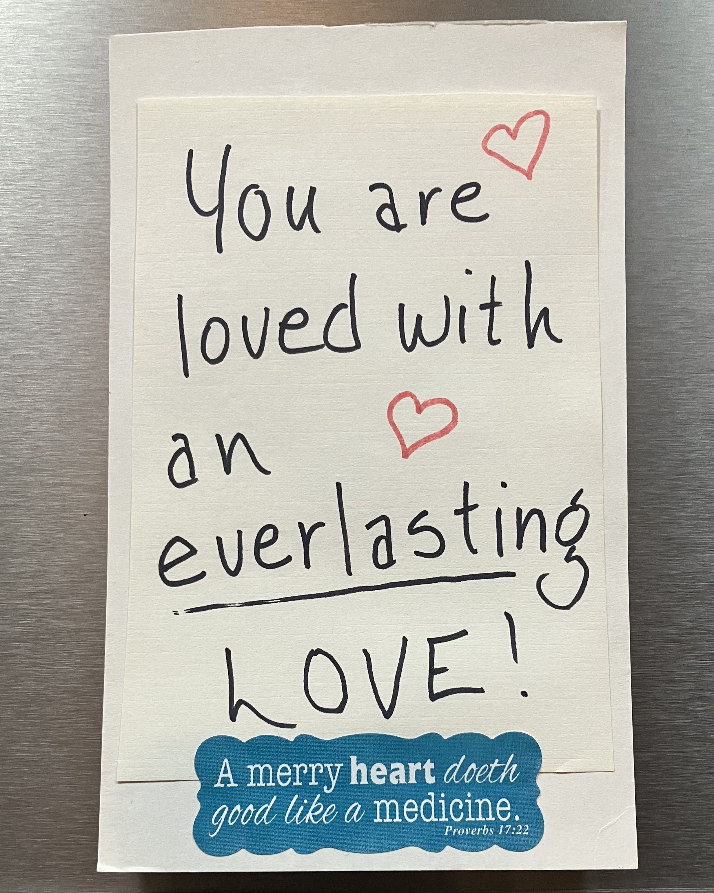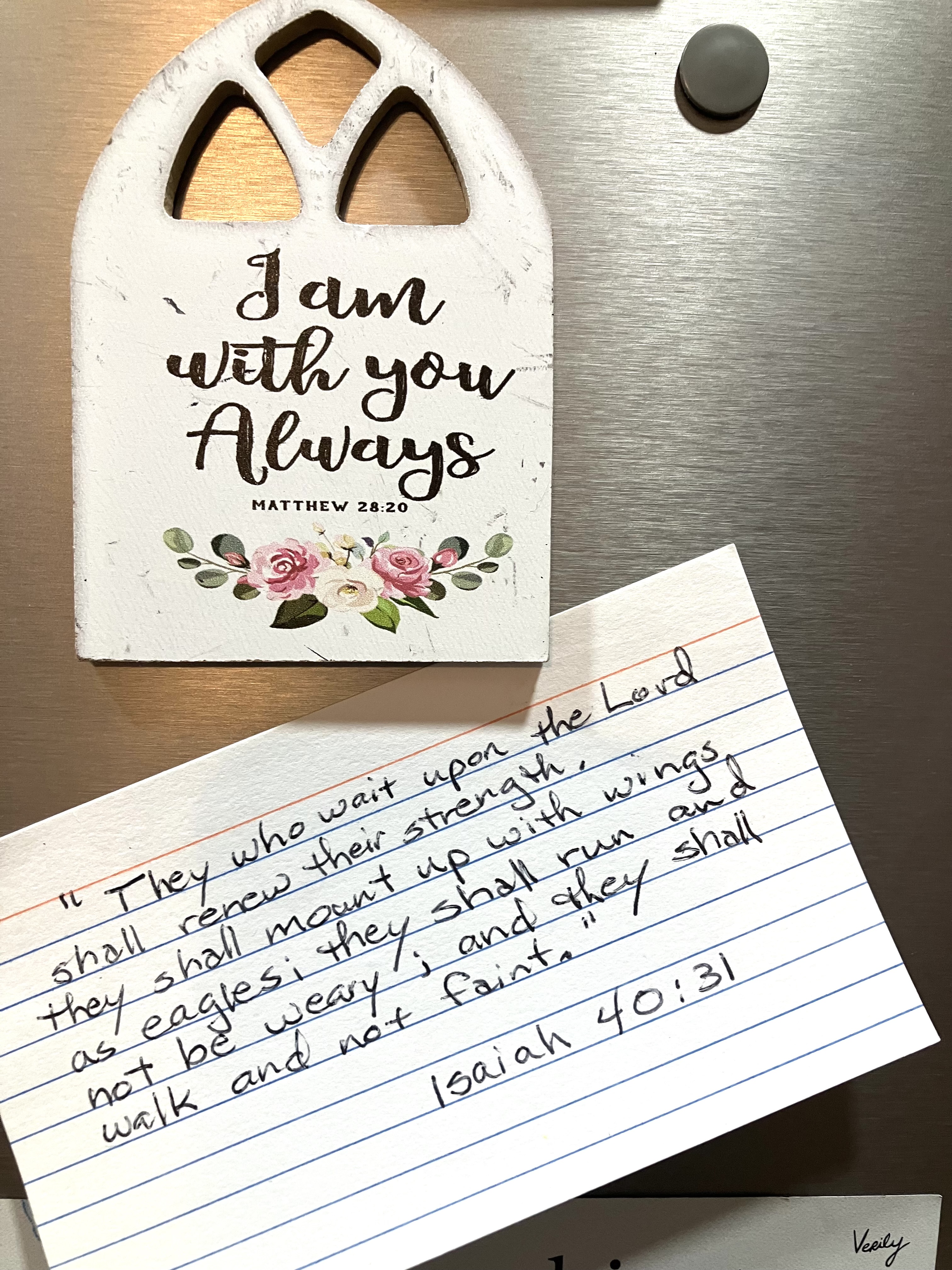 When I feel lonely, there’s a pretty refrigerator magnet which tells me…and you…we’re never alone. Then there’s the card which tells me God can help me when I’m tired.