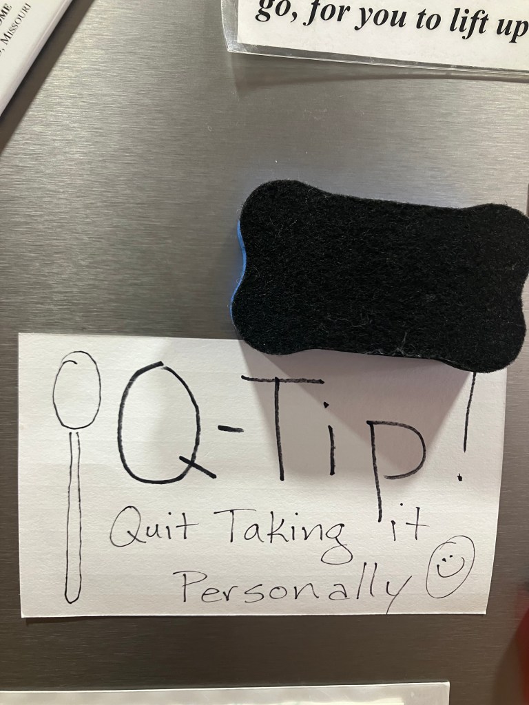 When I retrieve the cheese, the fridge reminds me to “Q-Tip” everything. “Q-Tip” means “Quit taking it personally.” Zowee. That would certainly heal my emotions.