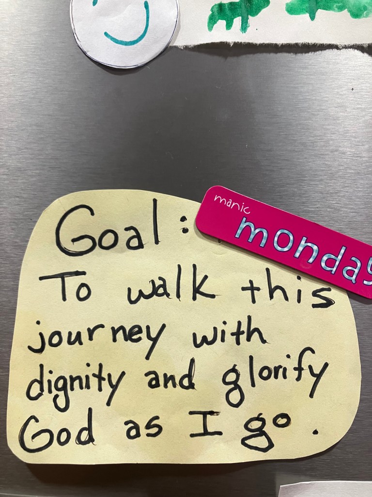 My refrigerator tells me to walk this journey with dignity and glorify God as I go. Good idea.